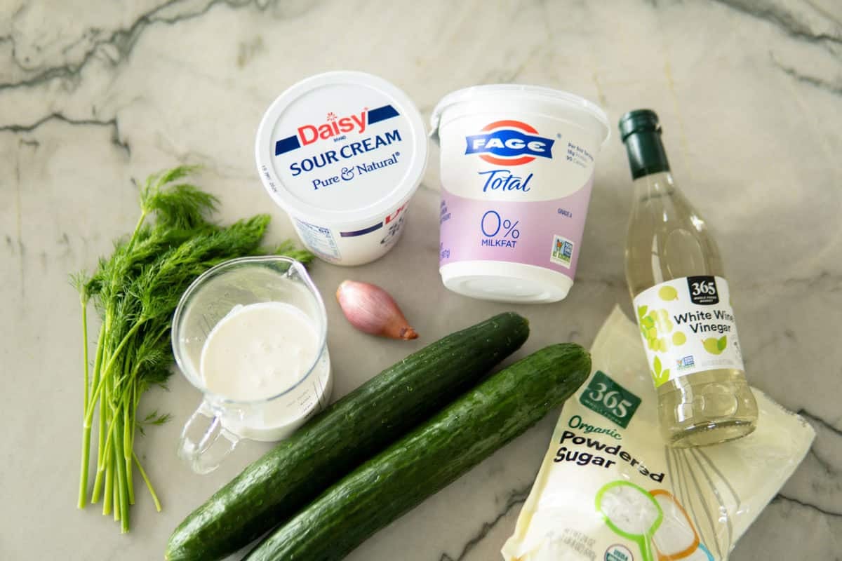 - Small dice the shallot and add it to a small bowl. Also add the Greek yogurt, sour cream, heavy cream, white wine vinegar, chopped dill, salt, white pepper, and powdered sugar. Stir to combine, then add to the salad bowl with the cucumbers to evenly coat.